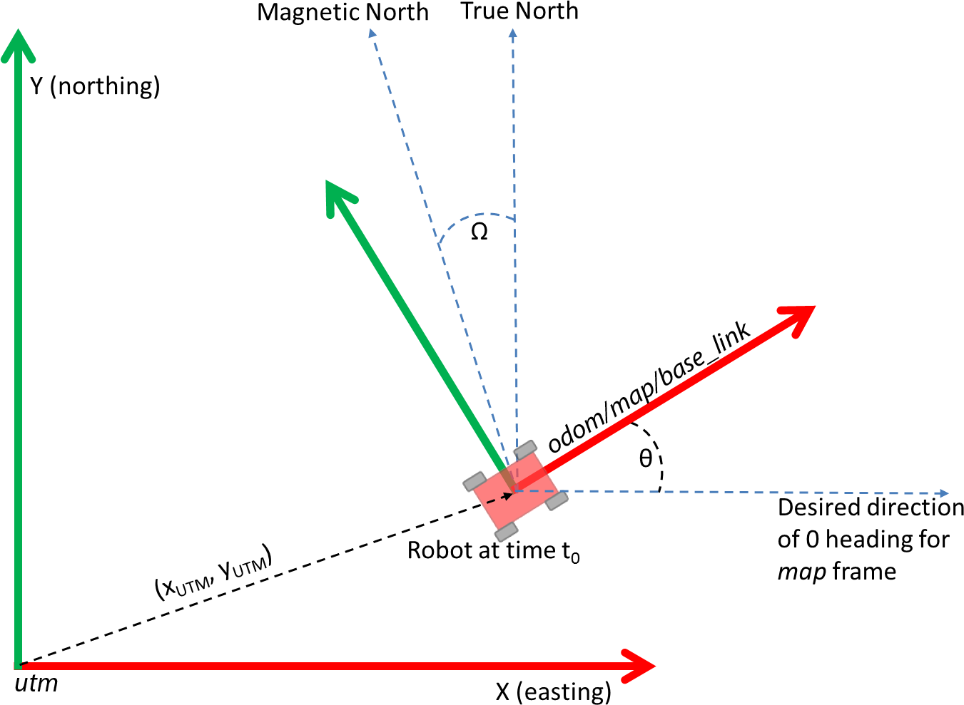 We now need to convert our latitude and longitude to UTM coordinates. The UTM grid assumes that the \(X\)-axis faces east, the \(Y\)-axis faces (true) north, and the \(Z\)-axis points up out of the ground. This complies with the right-handed coordinate frame as dictated by REP-105. The REP also states that a yaw angle of \(0\) means that we are facing straight down the \(X\)-axis, and that the yaw increases counter-clockwise. navsat_transform_node assumes your heading data conforms to this standard. However, there are two factors that need to be considered:
