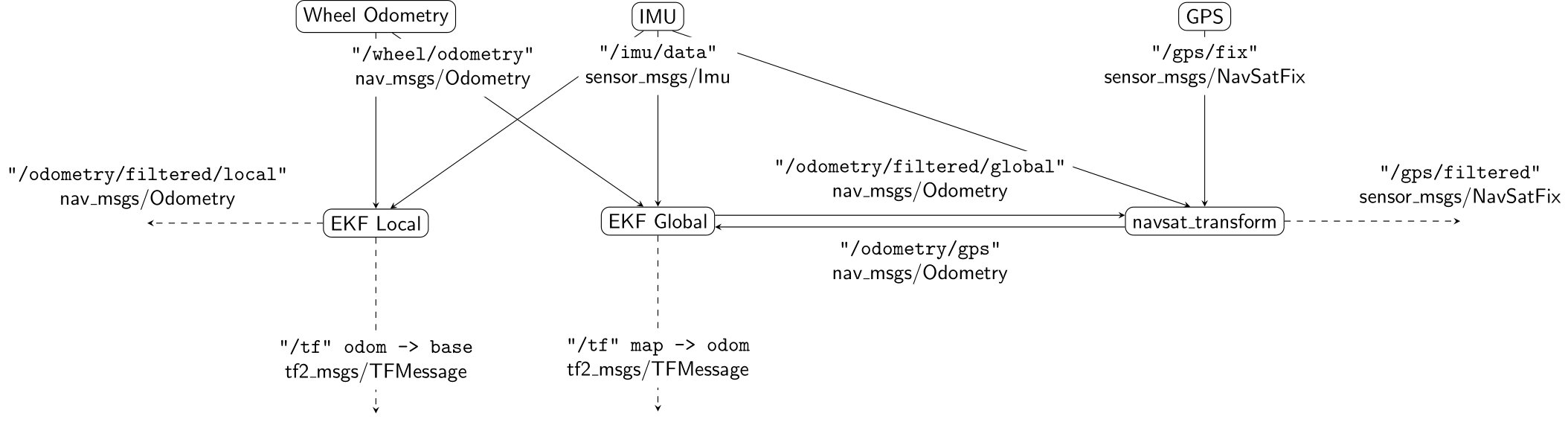 We now have a translation \((x_{UTM}, y_{UTM})\) and rotation \(\theta\), which we can use to create the required utm -> map transform. We use the transform to convert all future GPS positions into the robot’s local coordinate frame. navsat_transform_node will also broadcast this transform if the broadcast_utm_transform parameter is set to true.